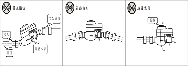 將表接頭套入接頭螺母后安裝到管道上,然后扭轉(zhuǎn)接頭螺母將水表安裝到管道上,保持水表讀數(shù)度盤水平向上,水表與管道連接時(shí)不應(yīng)受過大的折彎力,以免損壞水表接口斷裂。禁止出現(xiàn)如下圖所示的安裝方式: